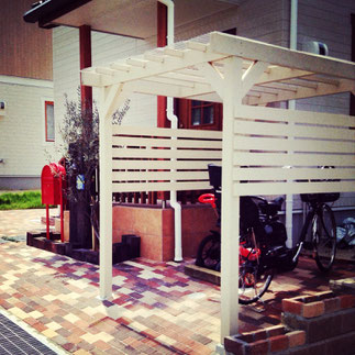手前の駐車スペースは「固まる土」でスッキリ自然な防草対策。