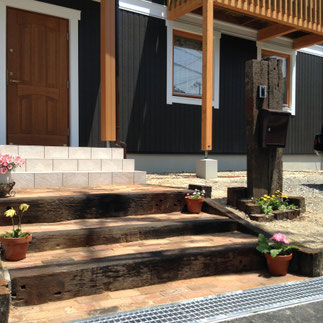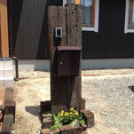 枕木門柱にポストとインターフォンを設置し、足元にはケンパスで囲み小さな花壇にしました。