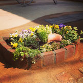 レンガを縦に埋めてモルタルでつなげて、アクセントに真中に陶器の長靴を埋めてみました。