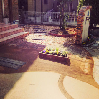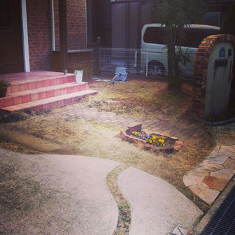 アプローチの両サイドが芝だったが、ご夫妻ともに忙しくなかな手入れが大変で、これを手間のかからない仕上げにするのがご依頼内容。